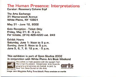 - May 2002. "The Human Presence: Interpretations" show at The Arts Exchange, White Plains, NY, USA.May 31-June 12 2002