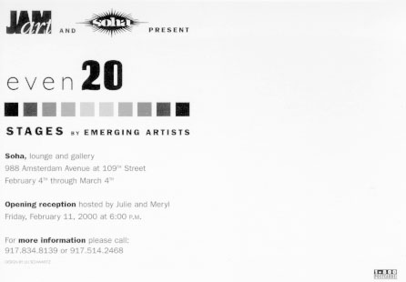- "Even 20: STAGES by Emerging Artists" at Soha 988 Amsterdam Avenue, at 109th Street. February 4th - March 4th 2000.