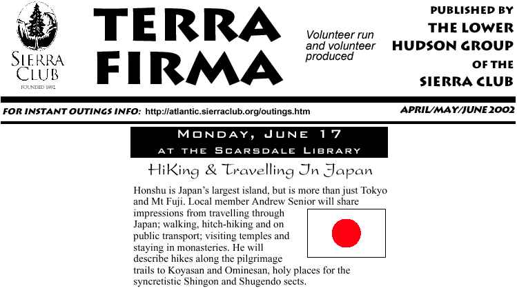 - June 17th 2002, Scarsdale Public Library Talk on `Shamanism, Shinto and Buddhism: Travels through syncretistic Japan' to the Lower Hudson Valley Sierra Club group.